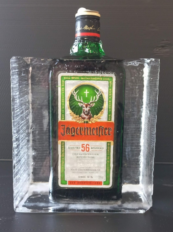 Voor Jägermeister mochten wij meerdere ijskoude opdrachten uitvoeren waarbij creativiteit en vakmanschap samenkwamen. Zo hebben we verschillende flessen Jägermeister volledig ingevroren in helder ijs, perfect passend bij de krachtige uitstraling van het merk.